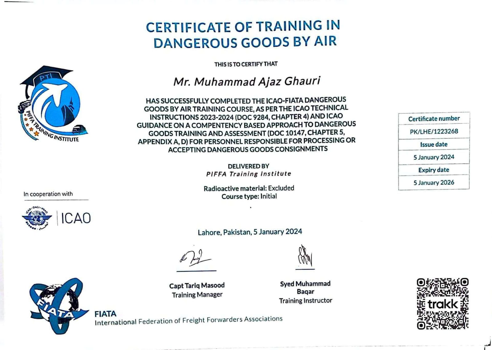 Mr. Ajaz Ghouri (CEO) Certificate From FIATA