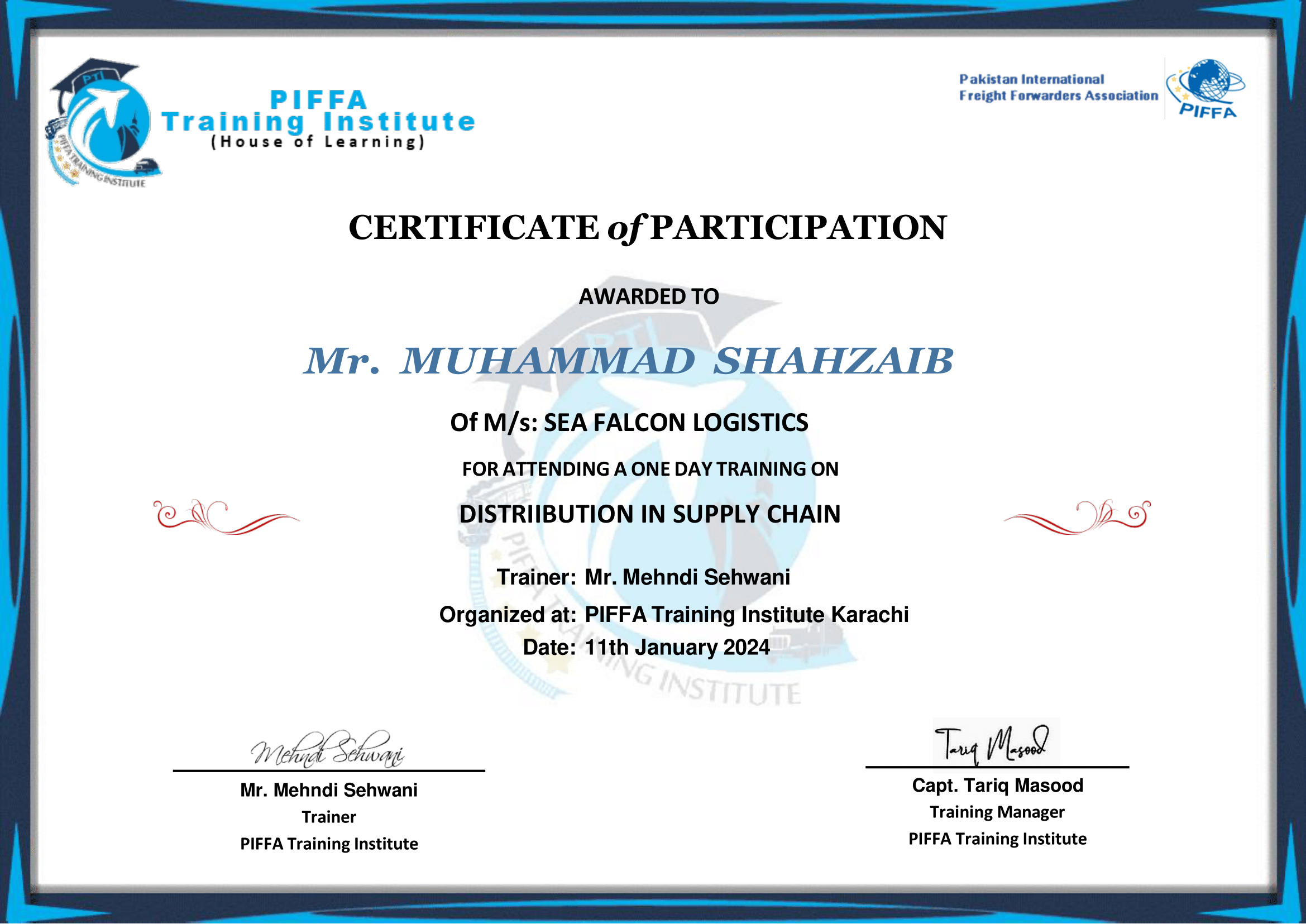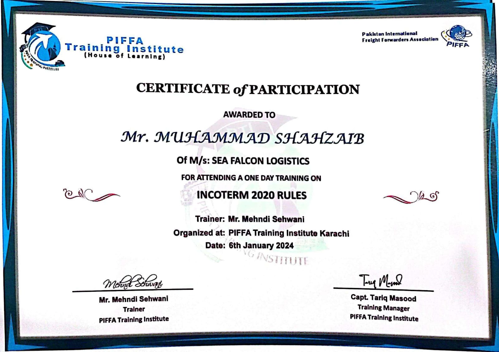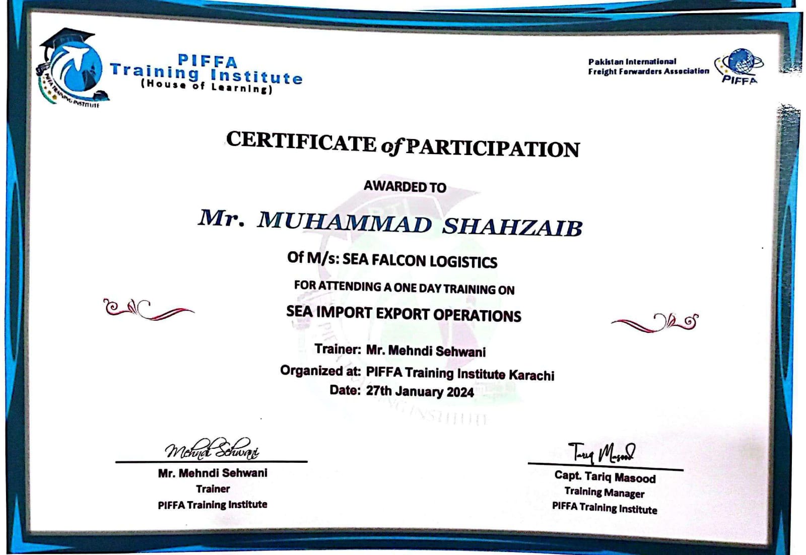Mr. Muhammad Shahzaib Certificate From PIFFA
