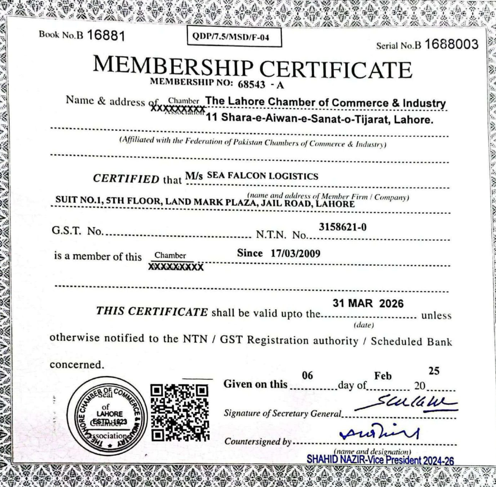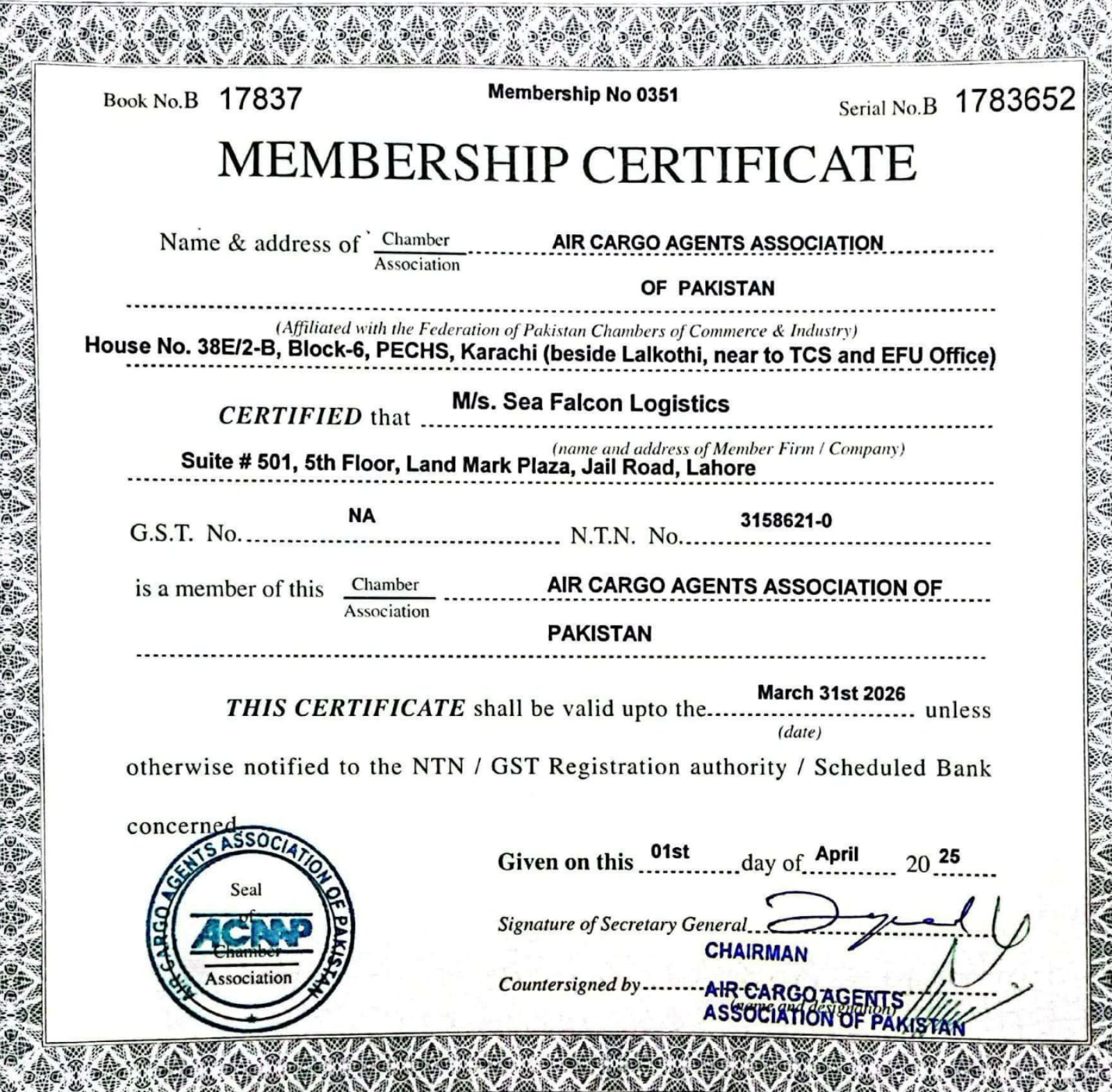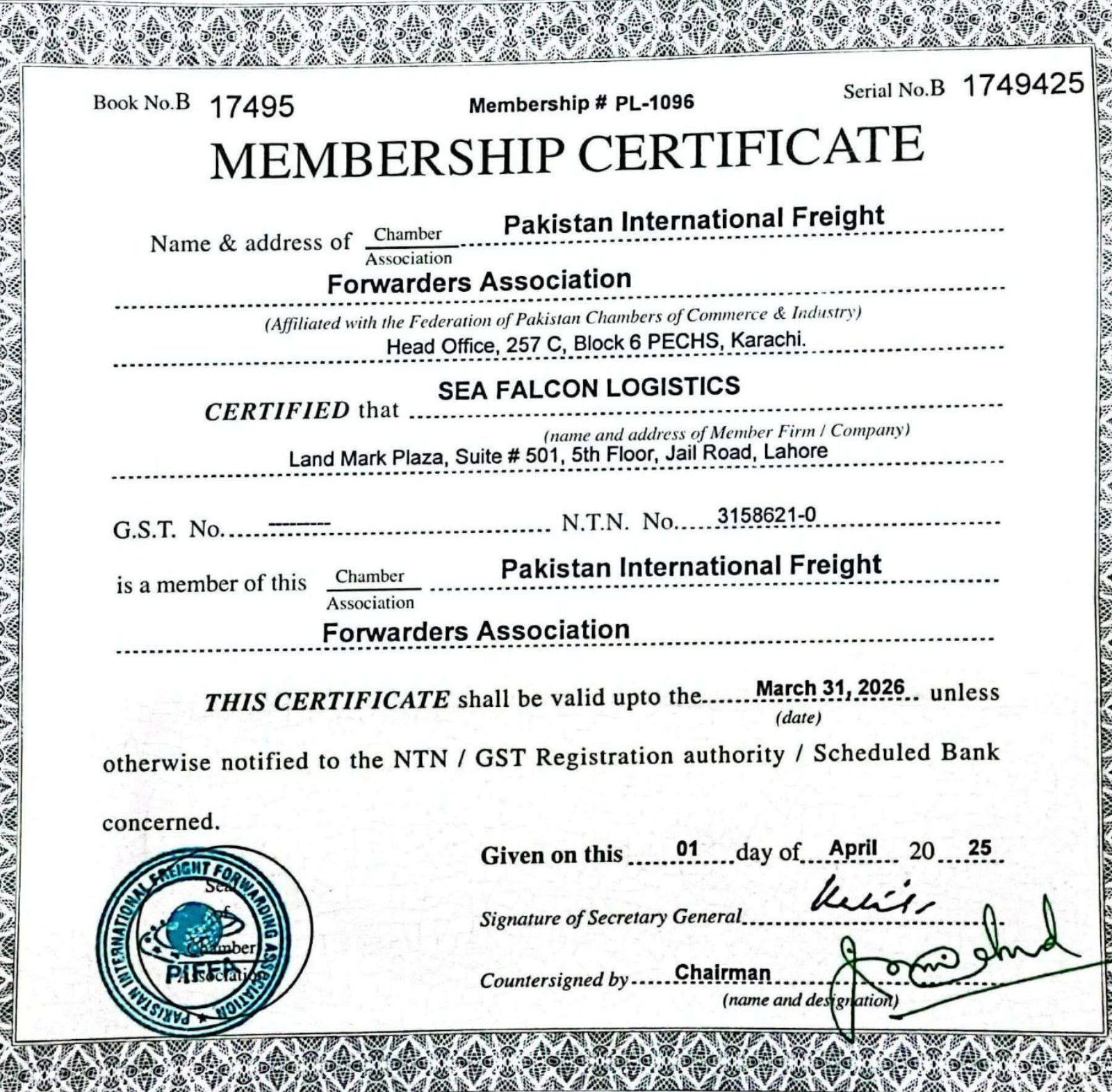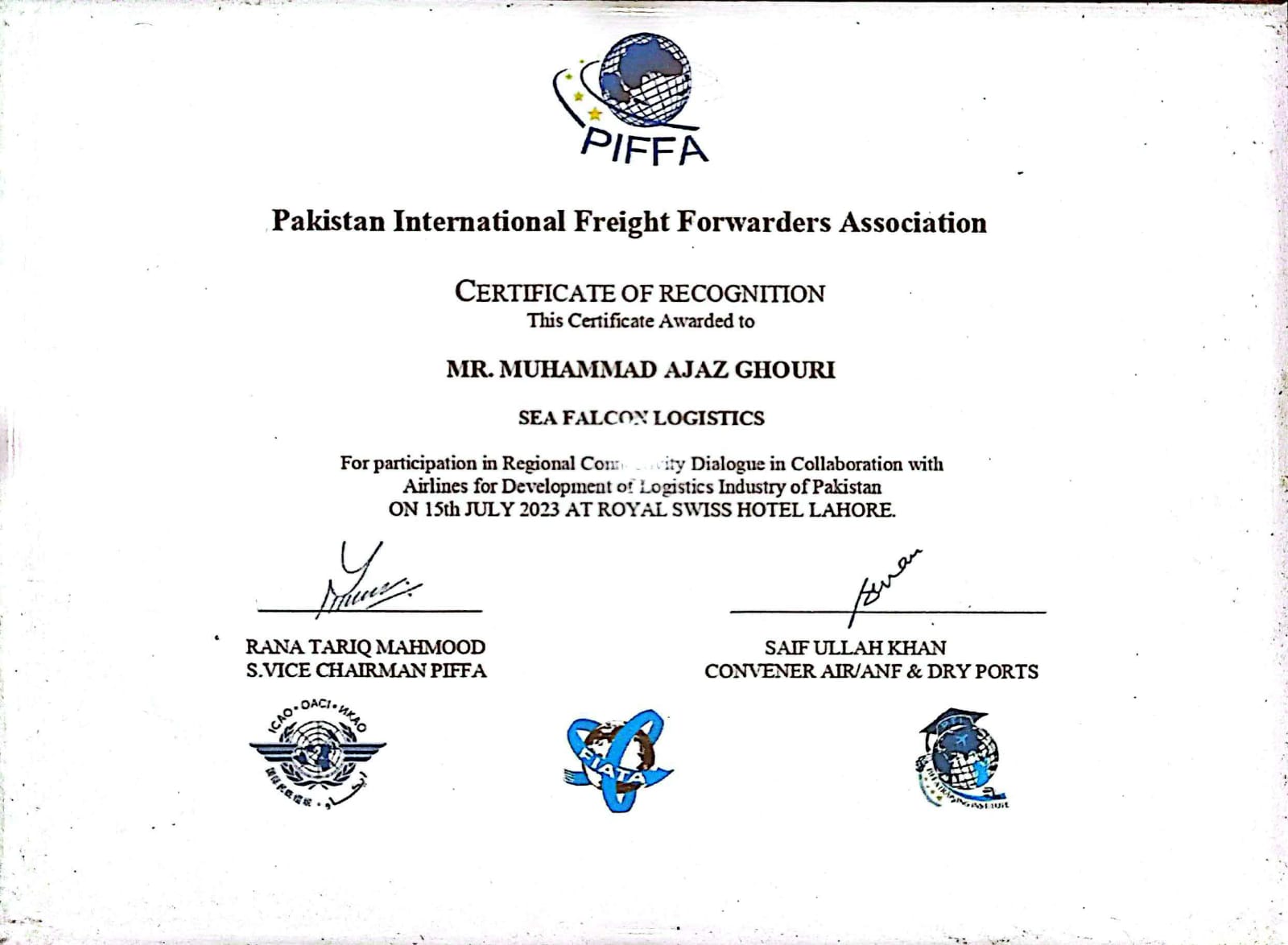 Mr. Ajaz Ghouri (CEO) Certificate From FIATA
